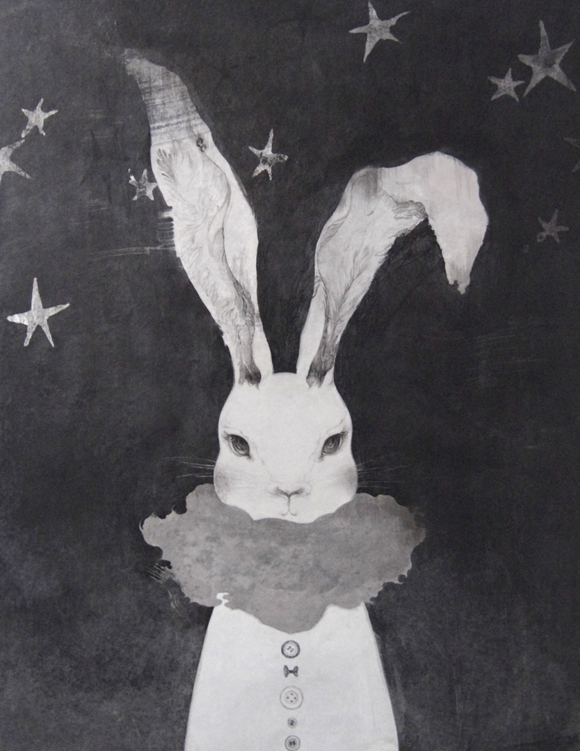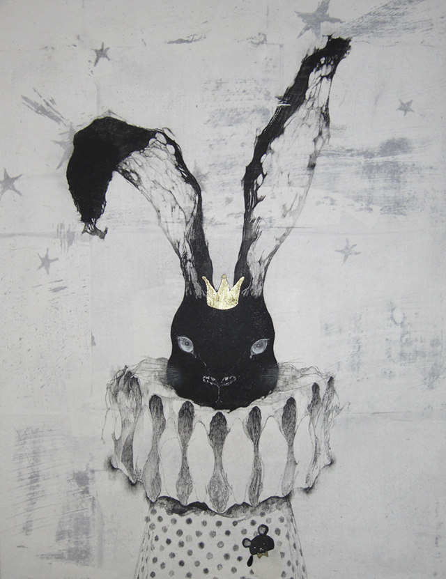 2010 clad in a bodypigment , japanesePaper Nursery tale rabbit"wsumi , dyeink , foil , japanesePaper Nursery tale rabbit"bsumi , dyeink , foil , japanesePaper HAPPY NEW YEARsumi , dyeink , foil , japanesePaper